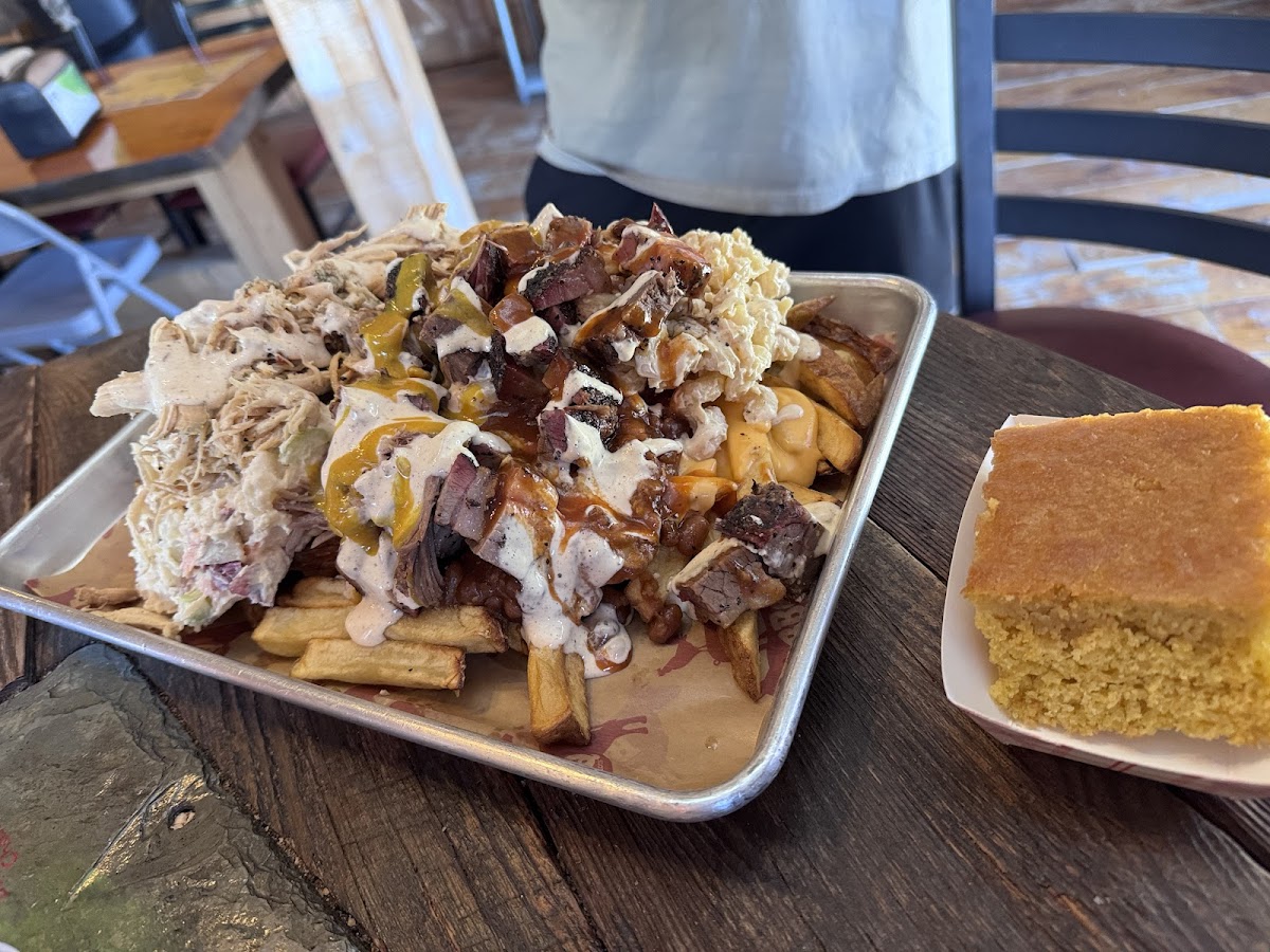 The portions are huge! I ordered the poutine appetizer with brisket, a side of coleslaw and a side of corn bread. Did not need the sides--the appetizer was HUGE! Everything everyone else order was huge, too. We were in town for the eclipse and were so glad we found this place. Really great food with large portions.