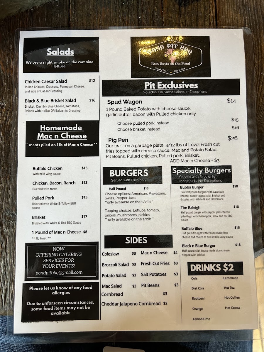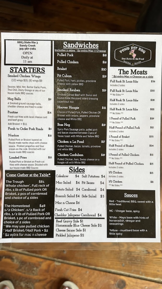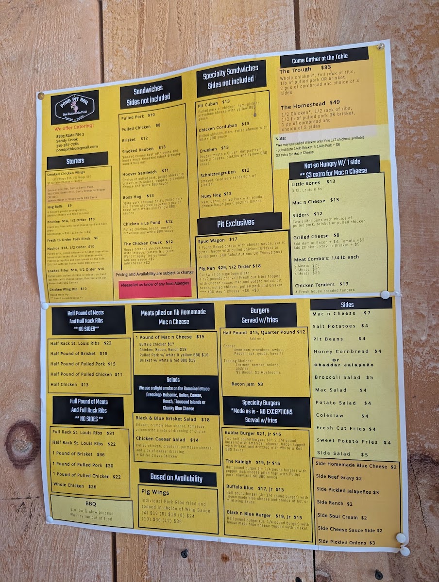 Pond Pit BBQ offers a straightforward menu focused on classic barbecue favorites, served in a relaxed, no-fuss environment. The selection features hearty meats like St. Louis ribs, pulled pork, and smoked brisket, paired with comforting sides such as mac and cheese and cornbread. Whether you’re stopping by for a casual lunch or a laid-back dinner, the menu suits anyone looking for satisfying, smoky flavors in a welcoming setting.