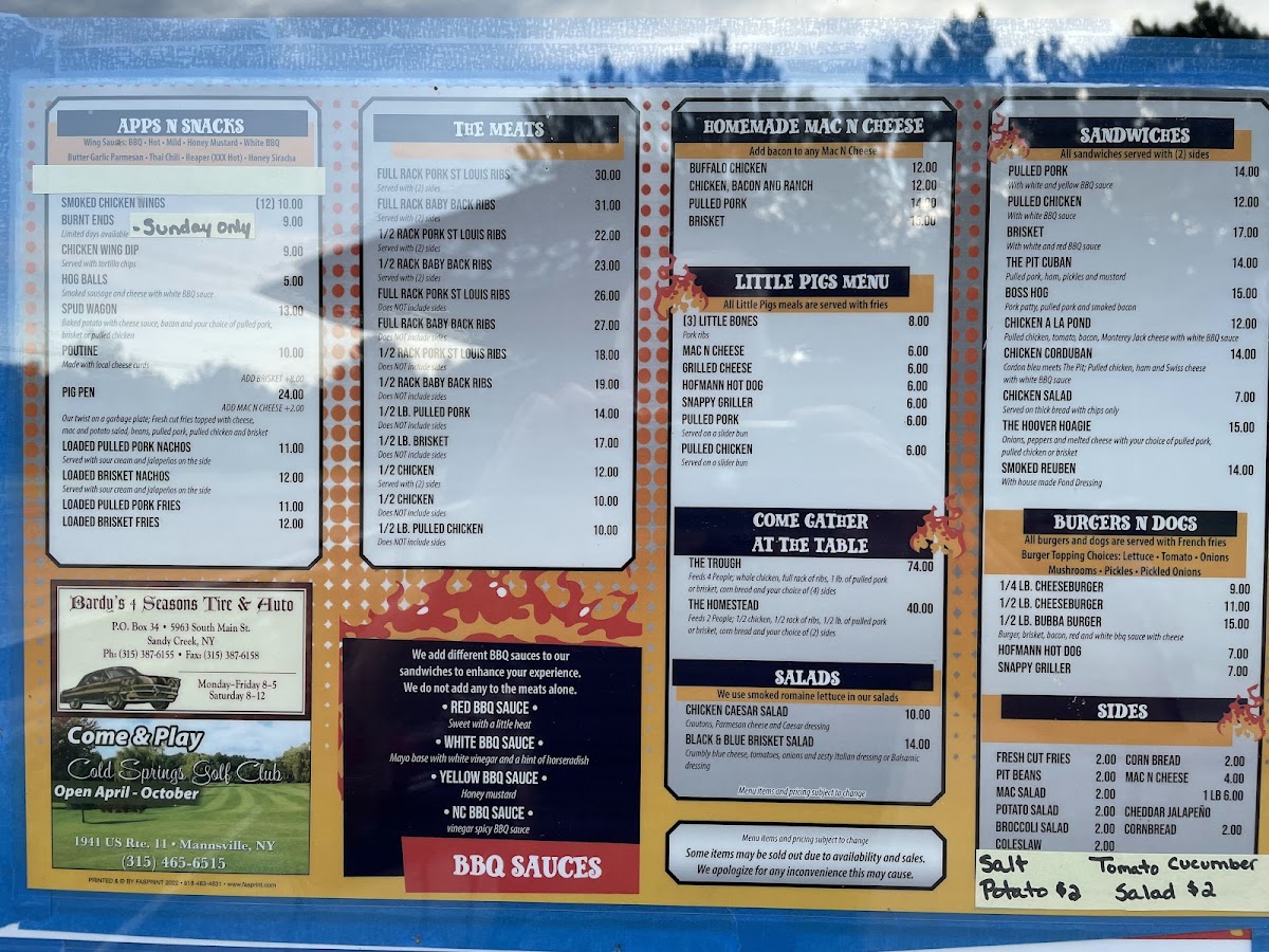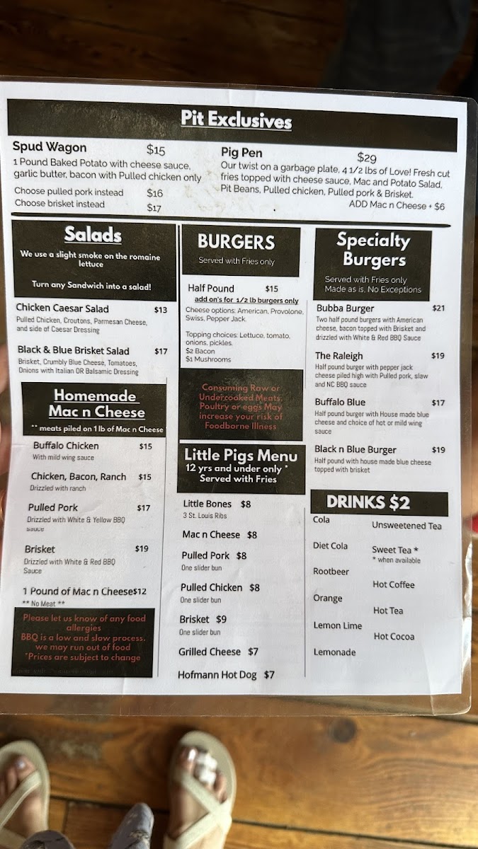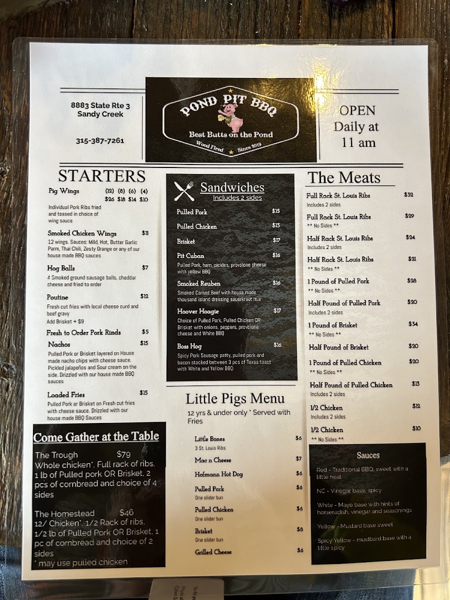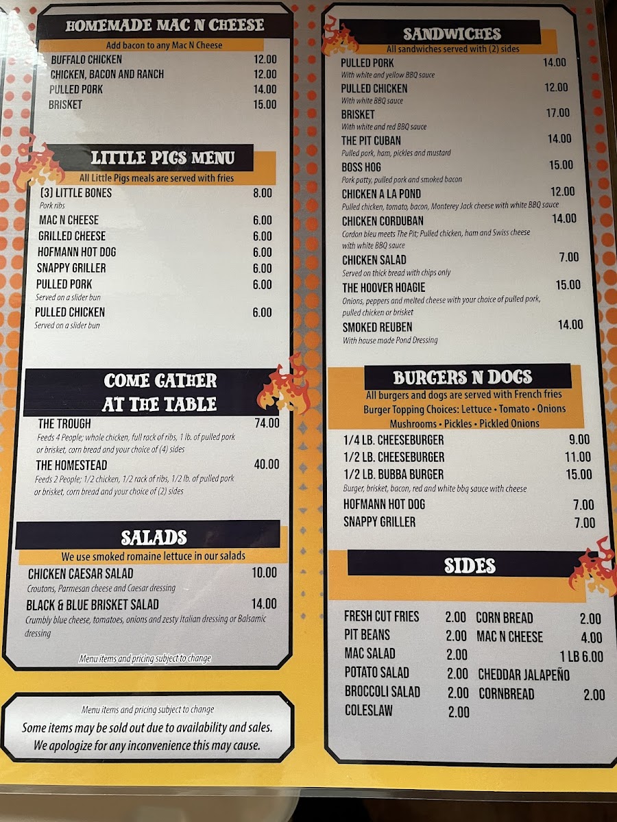 Pond Pit BBQ offers a straightforward menu focused on classic barbecue favorites, served in a relaxed, no-fuss environment. The selection features hearty meats like St. Louis ribs, pulled pork, and smoked brisket, paired with comforting sides such as mac and cheese and cornbread. Whether you’re stopping by for a casual lunch or a laid-back dinner, the menu suits anyone looking for satisfying, smoky flavors in a welcoming setting.